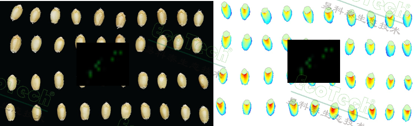 左图:FluorTron®台式多功能高光谱成像分析系统;中图:判断分析算法模型预测小麦种子活力(红色为活力高,蓝色为老化处理失活种子):右图:小麦种子实际萌发情况(EcoTech®实验室供图)